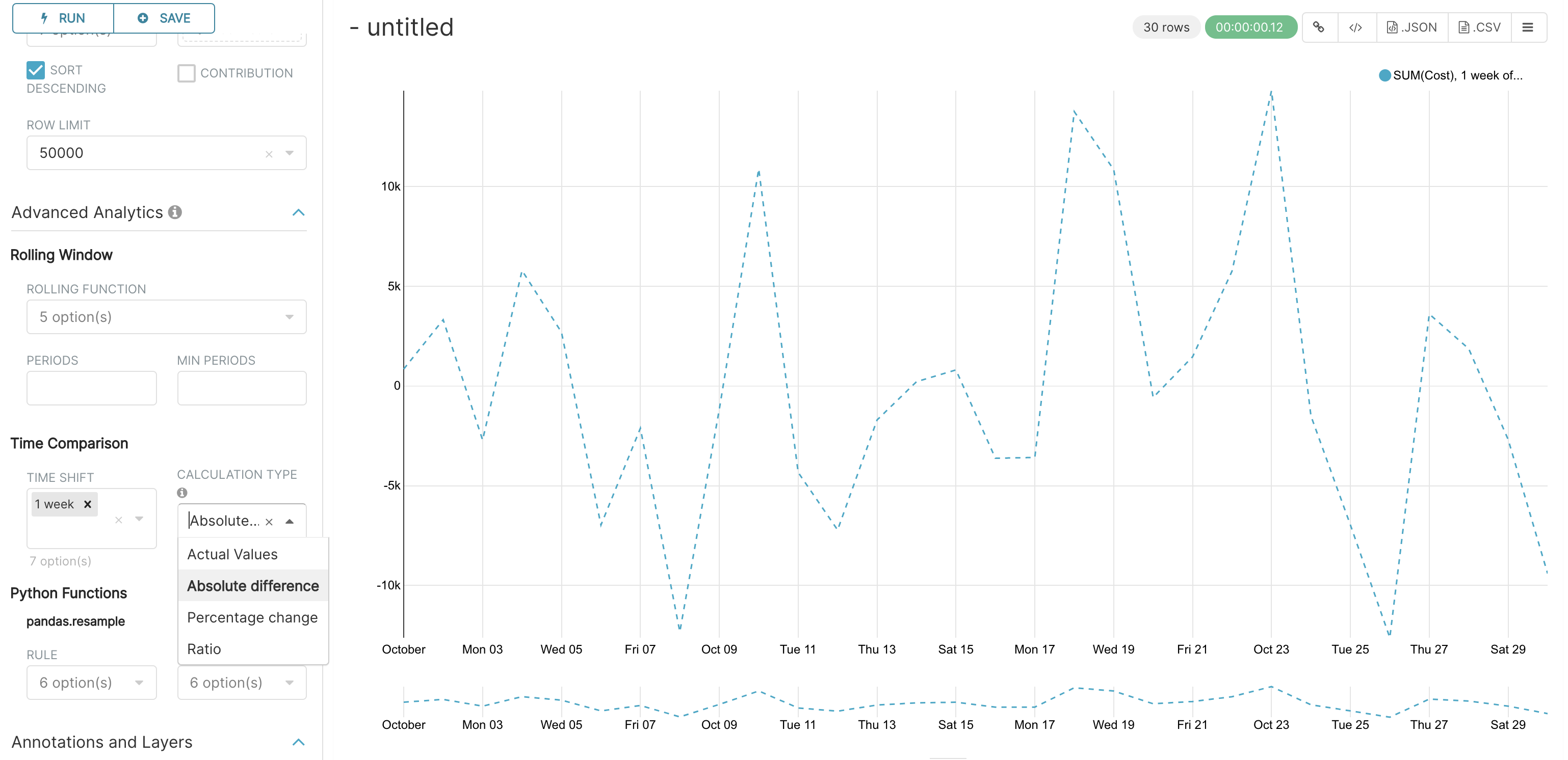 Then, change the Calculation type to Absolute difference and select Run Query. We can now see only one series again, this time showing the difference between the two series we saw previously.